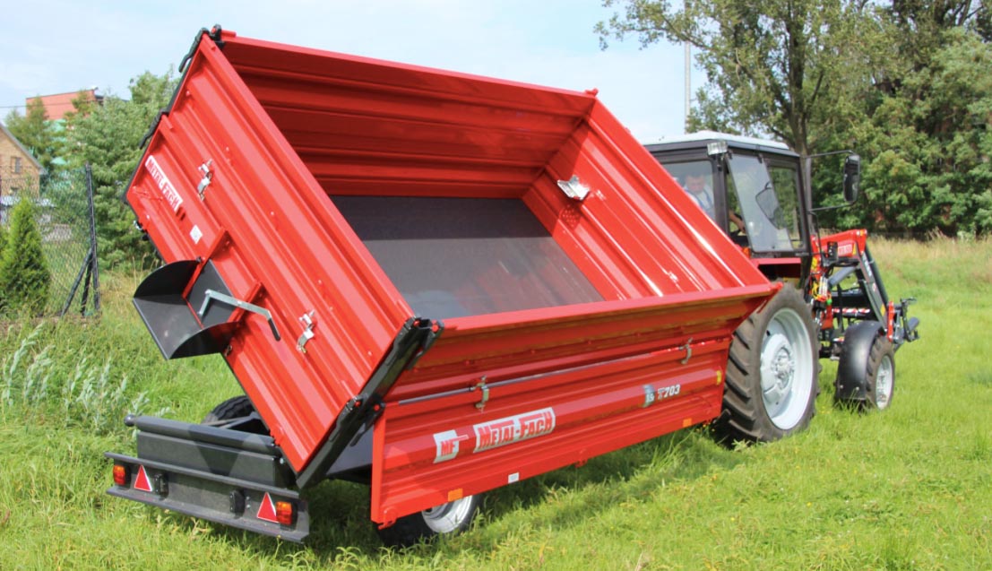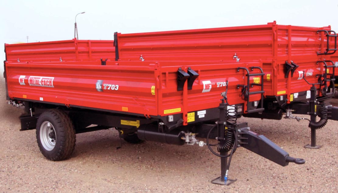 Найбільшим в серед одноосьових причепів є модель T703A. Причіп характеризується значною вантажопідйомністю, що становить цілих 3,8 тонни. З огляду на велику допустиме навантаження, він має товстий 4 мм підлогу. Бічні борти товщиною 2 мм, за запитом можуть бути пофарбовані різними кольорами, є достатнім захистом для безпечного транспортування вантажу матеріалу. Це універсальна машина, яка завдяки оснащенню однією віссю не викликає проблем з маневруванням, навіть на невеликих майданчиках. Завантажувальний простір може бути додатково захищено надставними сітковими бортами. Кожна з бічних стін - це окремий елемент, який має окремий блок замків. Таке рішення значно підвищує зручність повсякденного використання. Завдяки використанню відкритих профілів причіп має легку, але міцну конструкцію. Причіп може використовуватися для транспортування різних матеріалів, а для полегшення розвантаження сипучих матеріалів в задній стіні встановлено шибер з жолобом. Пристрій оснащений поліпшує безпеку центральною системою замикання бортів. Незалежна система бортів дає можливість тристоронньої вивантаження: задній або бічній. Завдяки відповідної жорсткості і герметичності конструкції, а також низького рівня підлоги транспортування матеріалу здійснюється ефективно і якісно.